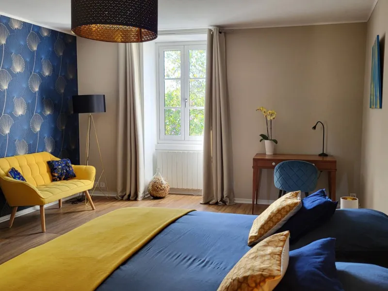 The rooms, classified as ‘Chambres d'hôtes Référence’ (Reference Guest Rooms), offer between 30 and 40 m² of comfort and serenity. They all feature high-end bedding with mattress toppers, a private bathroom with walk-in shower, toilet, Wi-Fi, hairdryer and courtesy tray with coffee, tea and mineral water. Some rooms also offer a lounge area or direct access to the garden. A microwave and a selection of hot and cold drinks are also available.