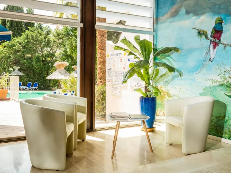 The enclosed park, its shadows, its gardens are just waiting for you. 300 metres from the Mediterranean and its fine sandy beaches, the hotel Le Quetzal*** welcomes you for an exceptional stay in the heart of the resort. 10 min from the Palais des Congrès, the Pasino and the marina.Localisation