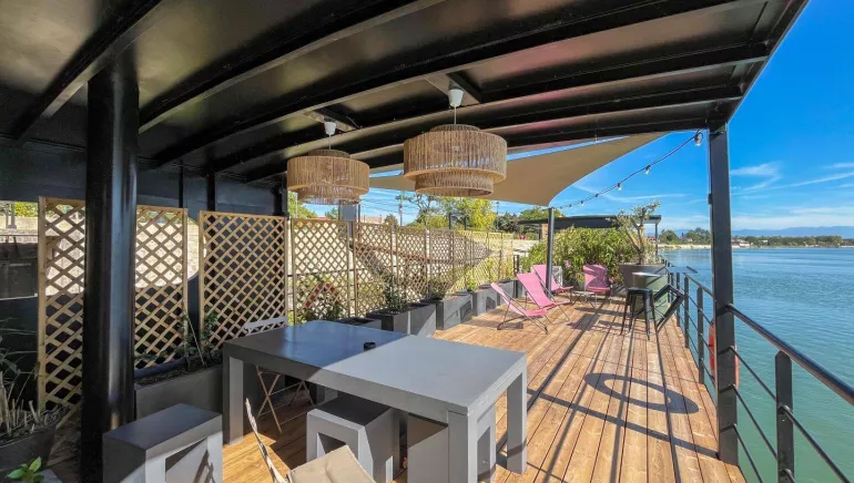 Vivez une expérience inédite en dormant sur l'eau ! Composé de deux gîtes avec entrées indépendantes, vous profiterez de deux terrasses spacieuses de 40m² et 30m², sans vis-à-vis, offrant une vue spectaculaire sur le Rhône et ses alentours.