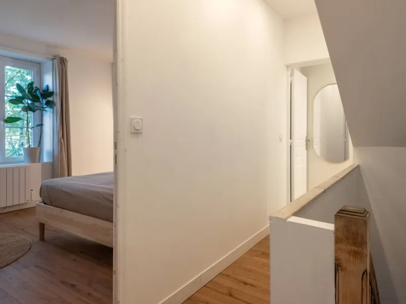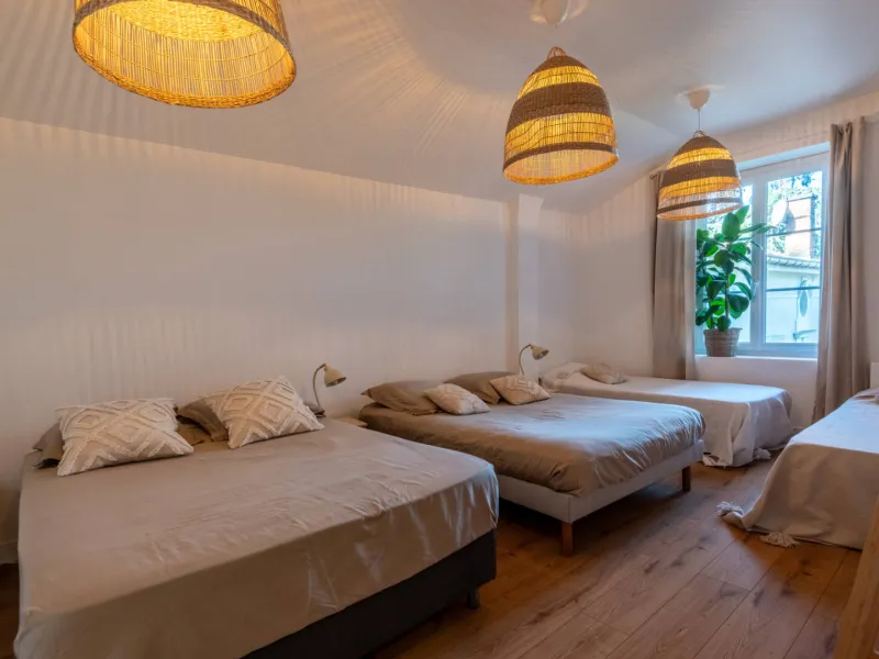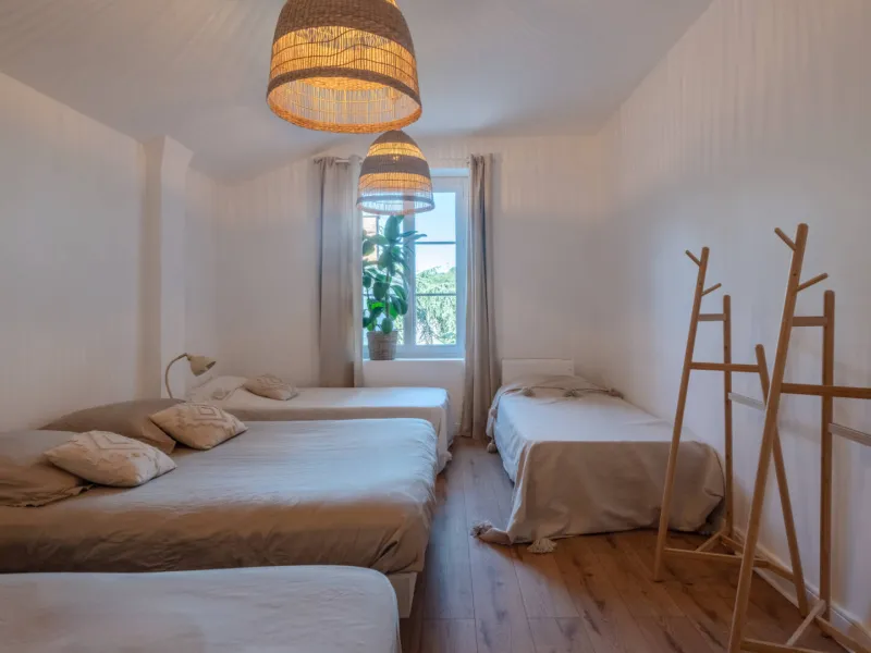 Étage : suite parentale avec salle de bain et WC séparé, grande chambre avec lit double + lits simples, deuxième salle d’eau moderne.
