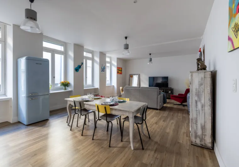 Rez-de-chaussée : salon cosy avec canapé convertible neuf, grande cuisine équipée et salle à manger conviviale.
