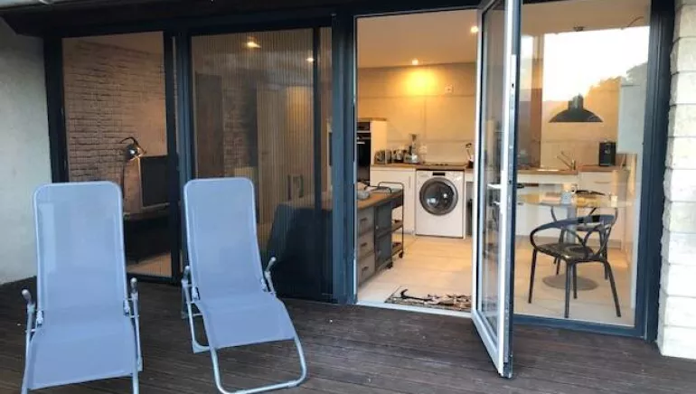 L'Indus is a gîte for 2 people, fully adapted for disabled guests. This bright, well-decorated ground-floor flat has a fully glazed living room overlooking the park with its magnificent panoramic views. From the living room or kitchen, you have access to a dedicated terrace where you can relax on the sun loungers and contemplate the landscape.