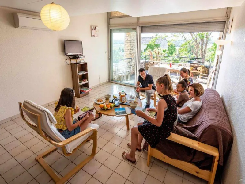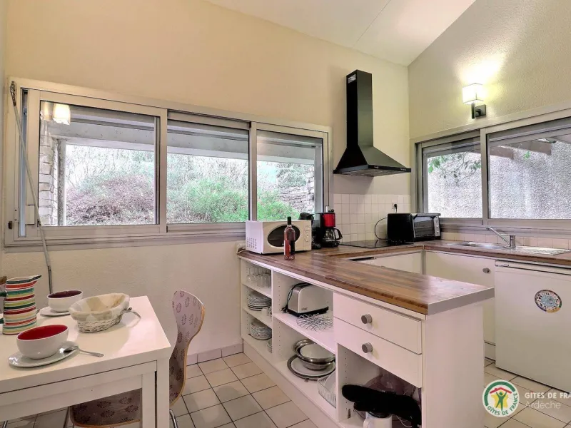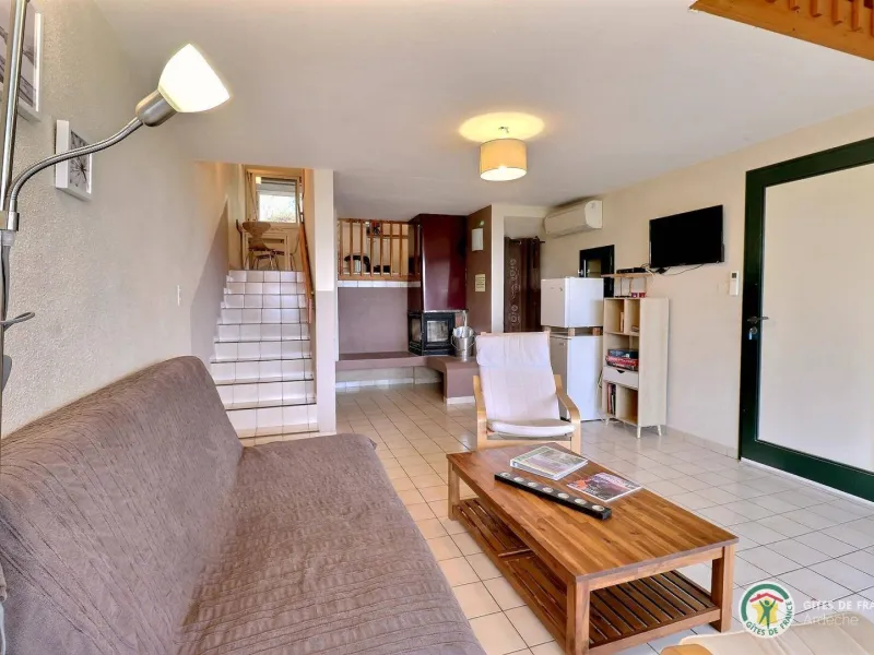 Living room (sofa bed), Television, kitchen fully equiped, mezzanine (1 double bed), room 1 (3 single beds), fireplace and wood to light it, baby bed and baby high chair on request, bathroom, toilets, electric heat, balcony, outisde seating area.Supermarket is 13km away.
