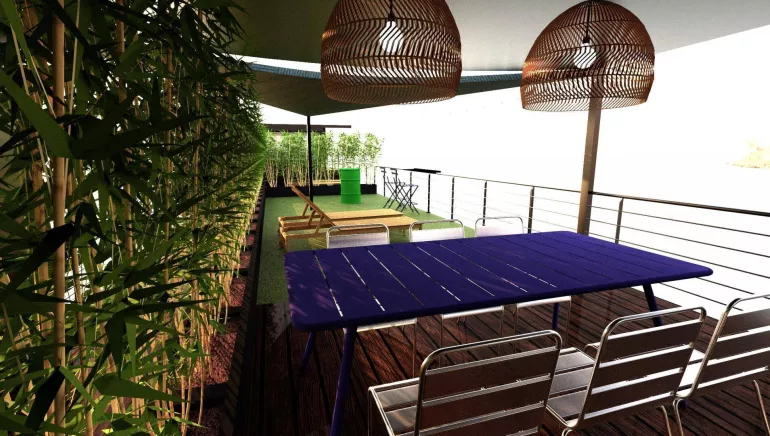 Dès votre arrivée, traversez la passerelle menant à une spacieuse terrasse de 40 m², entièrement équipée pour vos repas en plein air ou pour profiter de moments de farniente au soleil.