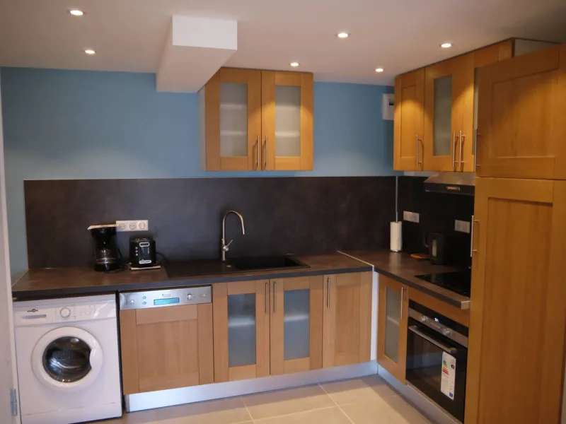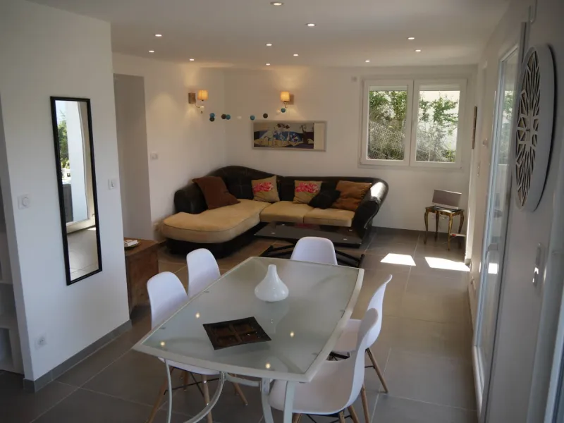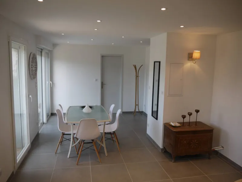 T3 de 65 m² + terrasse bois de 30m². Il est composé d'un séjour meublé avec canapé d'angle, tv grand écran, baie vitrée, cuisine intégrée ouverte sur séjour. Une salle de bain avec baignoire et douche à l'italienne. Une chambre avec lit 160x200, matelas confort, dressing et tv. Une chambre avec deux lits simples . Terrasse avec vue lac et Dent du Chat orientée ouest.