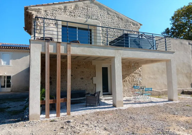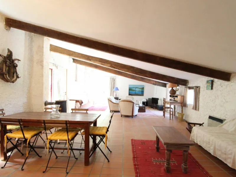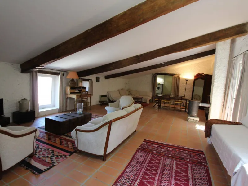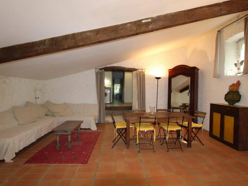 On the edge of the oak forest, in a protected environment, the castle of Fontblachère (XVII) is on the hills in the border of the Rhône Valley, between Valence, Montélimar and Privas. Quick access (10 min) from the highway. Heated swimming pool, private tennis in the park (quarters of lodge). "Le Loft" is housed in an old barn located at the back of the castle, access by path (starting hiking path), closed terrace with garden furniture and barbecue. Large room of more than 60 m² with dining area and sitting area (sofa, armchairs, 2 beds of 90cm), equipped kitchen, 1 bedroom (1 bed of 140cm), bathroom and toilet.Localisation